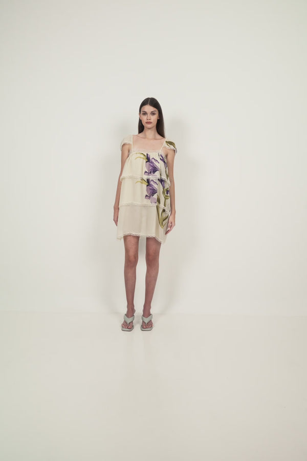 A silk mini dress designed with a softly structured square neckline and delicate cap sleeves. Cut with a relaxed, straight silhouette, it features tiered panel detailing through the body for subtle volume and movement. Finished with fine lace trim along the neckline, sleeves, and hem, adding texture while keeping the overall shape light and fluid.