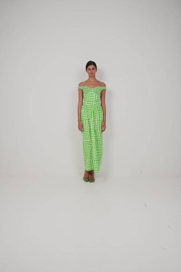 An off-shoulder maxi designed with shirring through the bust to shape and define. The fitted bodice flows into a softly structured skirt, balancing form and movement. With its clean neckline and flattering silhouette, this style embodies modern femininity with a confident ease.