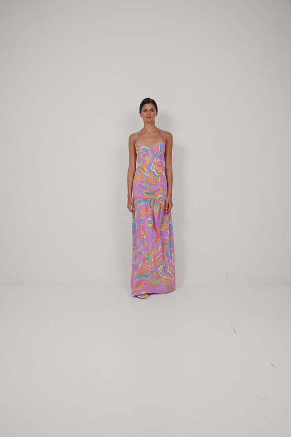 A vibrant poplin maxi defined by its halter neckline and softly fitted bodice. The fluid swirl print in sunlit pastel tones brings colour and movement, making it perfect for warm days and relaxed evenings alike.