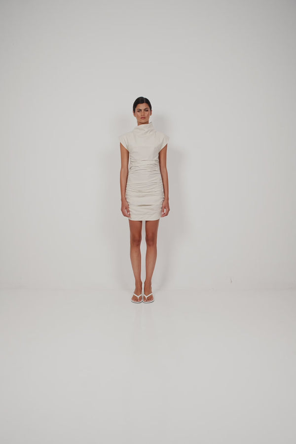 A statement mini designed with a structured high neckline and refined cap sleeves. The bodice features clean lines that balance the soft ruching through the skirt, creating a flattering, contoured shape. Its sculptural silhouette brings a modern edge, making it a standout choice for evenings and elevated occasions