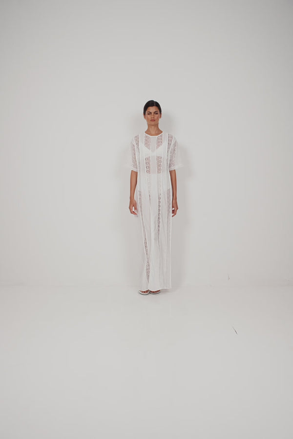 A light and airy maxi crafted with delicate sheer paneling that creates a beautiful interplay of texture and transparency. The relaxed silhouette drapes softly over the body, while short sleeves and a round neckline keep the look refined and wearable. Intricate lace-like details add dimension throughout, giving the piece a graceful, elevated finish. Designed for warm days, coastal escapes, and laid-back elegance.