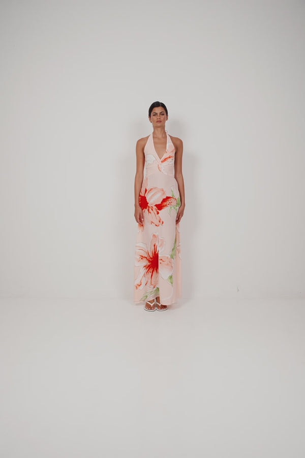 A standout silhouette crafted with a soft rayon, this halter-style maxi features a twist-front detail that shapes the bodice and creates a flattering, sculpted fit. The halter neckline lend a modern touch, while the skirt falls into a smooth, elongated line that moves gracefully. Designed for warm days and elevated evenings alike, it brings a refined sense of ease to any occasion.