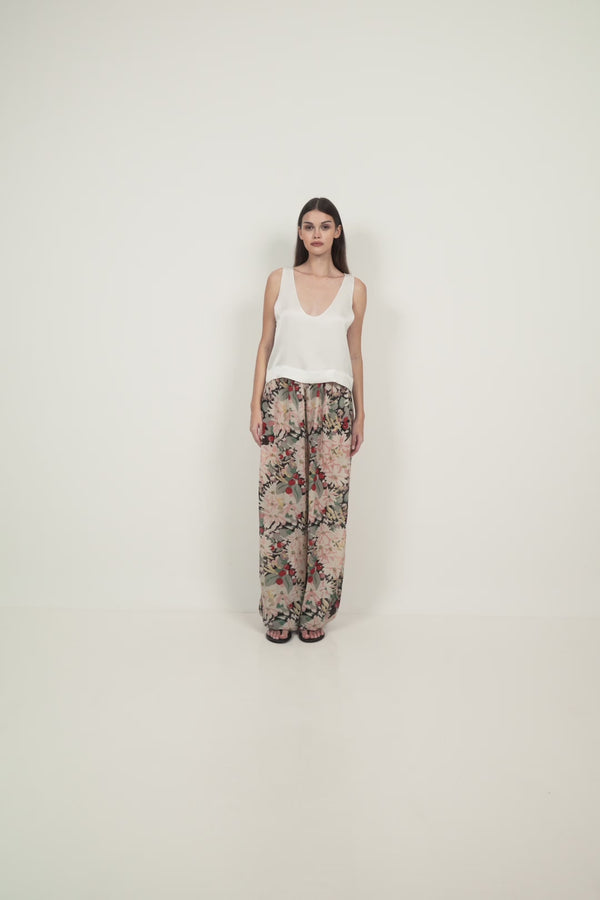 A balloon-style pant designed with volume through the leg and a relaxed, fluid shape. Cut with a high-rise elasticated waistband for comfort and ease, the silhouette tapers softly toward the hem while maintaining movement and drape. Crafted in a lightweight, silky fabrication, the pant falls away from the body and highlights the Dust Bloom print. Designed to be styled with simple tops or paired back with the Satin Scoop Top for a complete look.