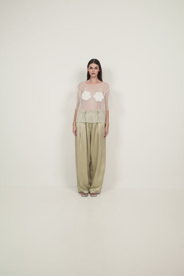 A relaxed satin pant featuring a fluid, wide-leg silhouette and soft elasticated waistband, allowing the fabric to fall naturally with movement, pair back with the Sheer Bloom Top.